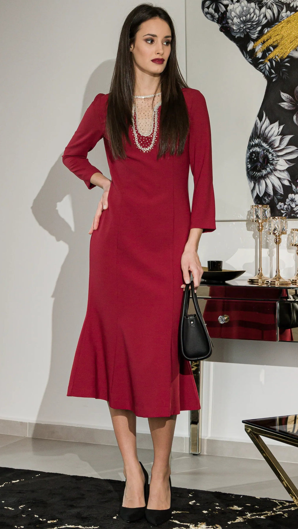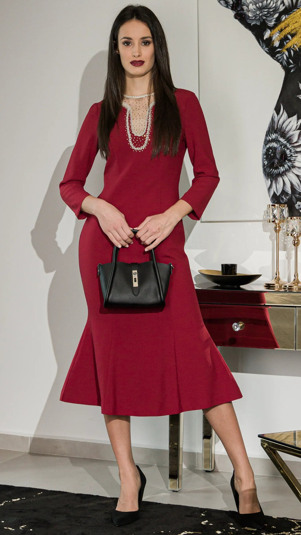 Slim-fit mermaid gown with long sleeves, delicate nail bead embellishments and a high-waist fishtail silhouette. Designed in a deep burgundy hue that evokes mystery, elegance, and quiet confidence.