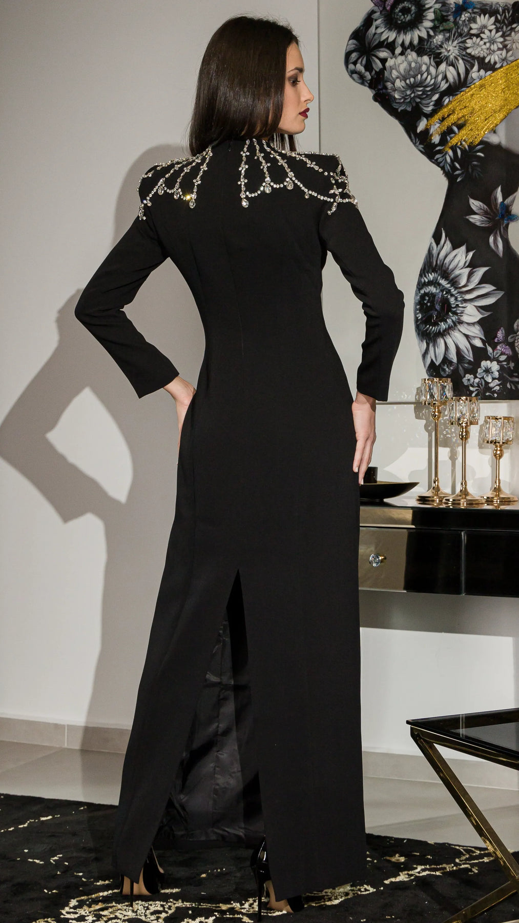 Flowing maxi dress with a mid-waist cut and long tailored sleeves. Embellished with delicate diamanté accents and finished with a soft A-line drape for an elegant, timeless silhouette.