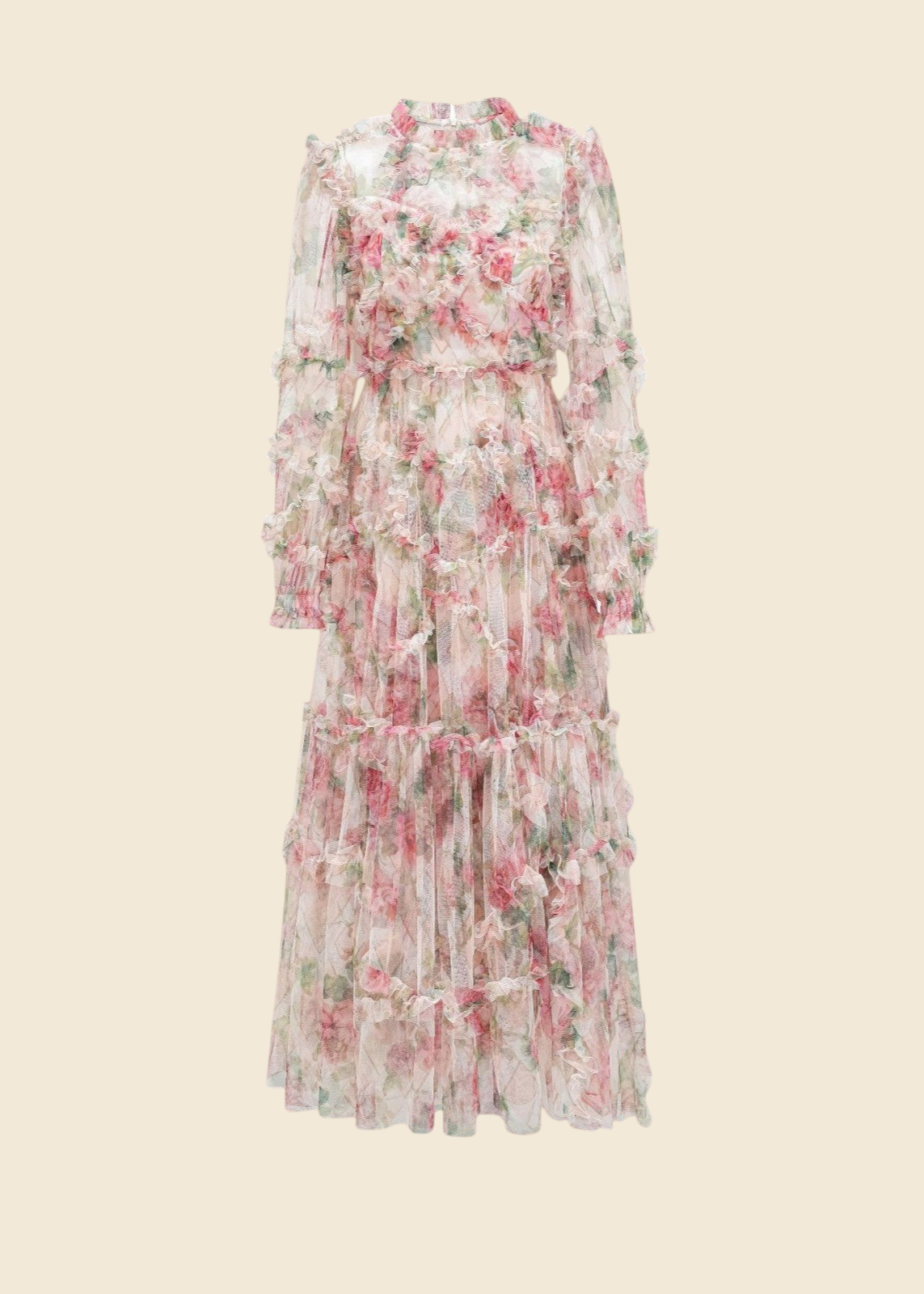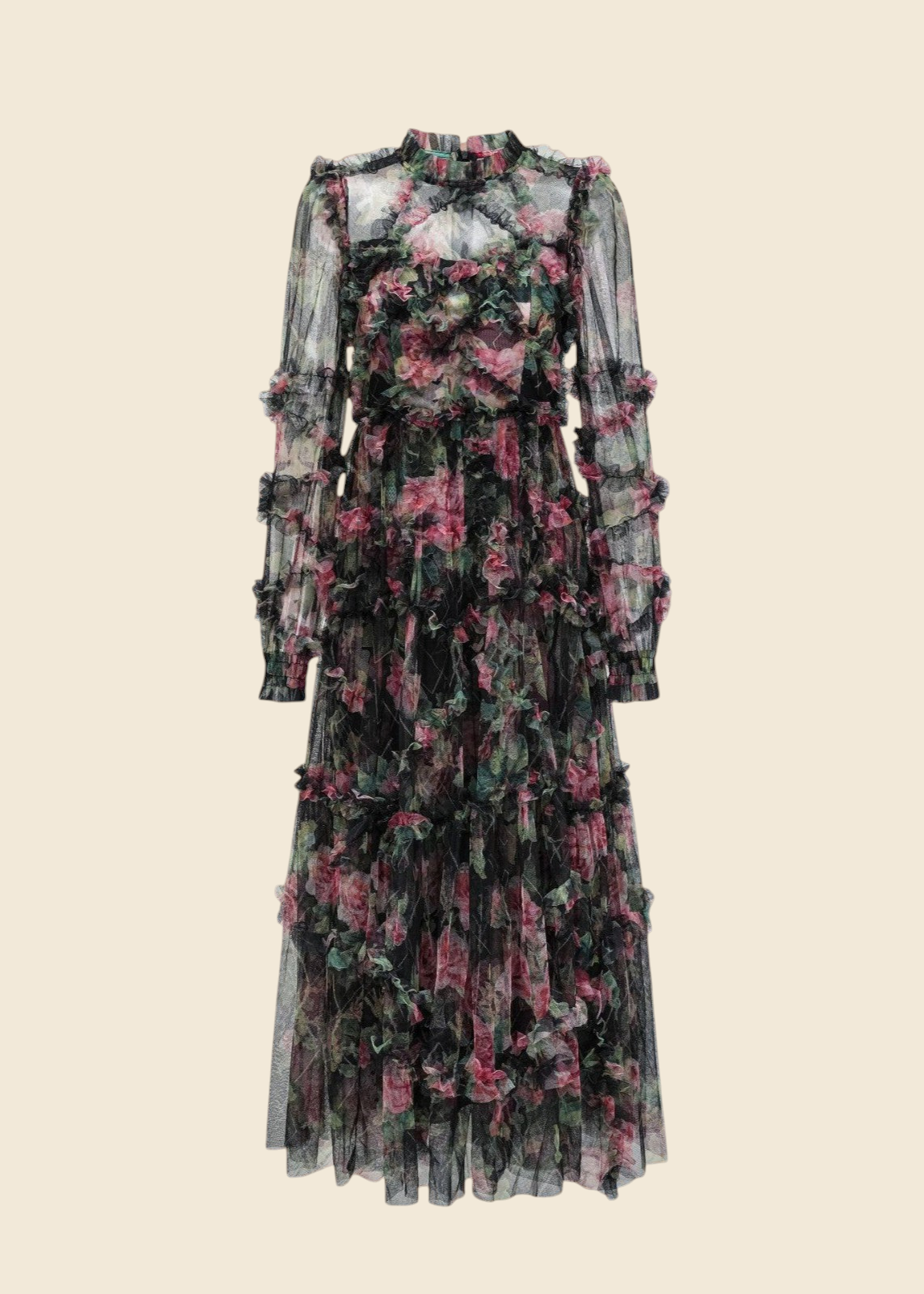 Ethereal maxi gown designed to capture feminine elegance. Featuring soft ruffles, sheer mesh sleeves, and a high neckline that exudes timeless romance and grace.